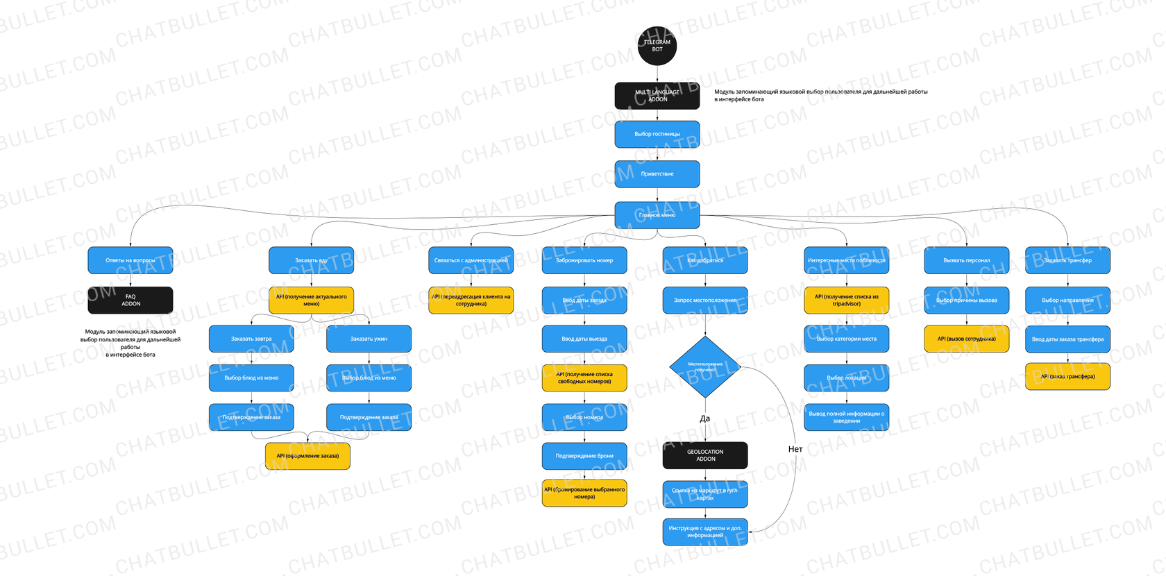 Using the geoposition module, the bot will show the nearest hotel in your network or display the addresses of all of them if none of them is nearby